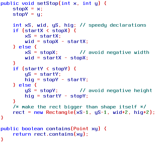 private Rectangle rect;among the other declared variables. Now we must figure out were to instantiate it. The obvious place is when we learn to know the stop coordinate, since we know the starting point from the very beginning but the final point is not known until the complete shape is set up. That is made in the setStop method. Further you see in the Java API that a Rectangle is most easily constructed with x, y, width and height. And we would not like to do the mistake of using negative values to width and height, don't we? The code is found beneath.