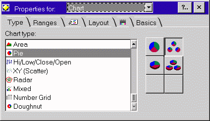 Actually getting 1-2-3 to print my spreadsheets was a bit more of a challenge. I have a Canon BJC-600 color printer. It works well for my OS/2 printing needs and I've never had trouble with it. When I set 1-2-3 to print in color to it, the bulk of the spreadsheet simply didn't print. Parts of it did, the occasional bitmap and some text, but most of it was simply missing. Printing to the exact same printer using the Postscript driver and Ghostscript using the technique from my September 2000 article on Printing From a Mac worked like a charm, both in black and white and in color, as did printing to the Canon driver if I set it to grayscale printing. Exporting to the WebOne of the big features in the newer versions of SmartSuite is the ability to publish your data to the web. I experimented with this feature by exporting the sample loan amortization spreadsheet above to the web. I found two little hitches when I tried this. First, when I tried to change the export directory, I discovered that you have to select a file name in the directory selection dialog or it won't let you leave that dialog. Don't worry, it won't use the file name you select in the directory dialog, it will save the file to the file name you entered in the previous screen. The other problem occurred when every cell my spreadsheet imported from Mesa that had text in it ended up as black on black. Since the sample spreadsheet didn't have this problem, it is probably just a matter of setting the background color for the sheet in 1-2-3 once. The resulting web page is a decent representation of the original spreadsheet, I like that they allow for author, email contact and a spot to download the original sheet. If your website is accessible by FTP, you can directly send your spreadsheet export via FTP right from within 1-2-3. I can see myself using this feature in the future.ChartingMaking charts from your spreadsheets is amazingly easy. There are 12 types of chart to choose from with up to six variations on each type to fine tune your graphics.