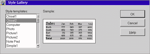 Particularly handy is the rightmost tab, the Style tab. This allows you to quickly create styles based on existing cells, or apply an existing style to a range of cells. 1-2-3 comes with a bunch of attractive sample styles which you can select from the style gallery as shown below.