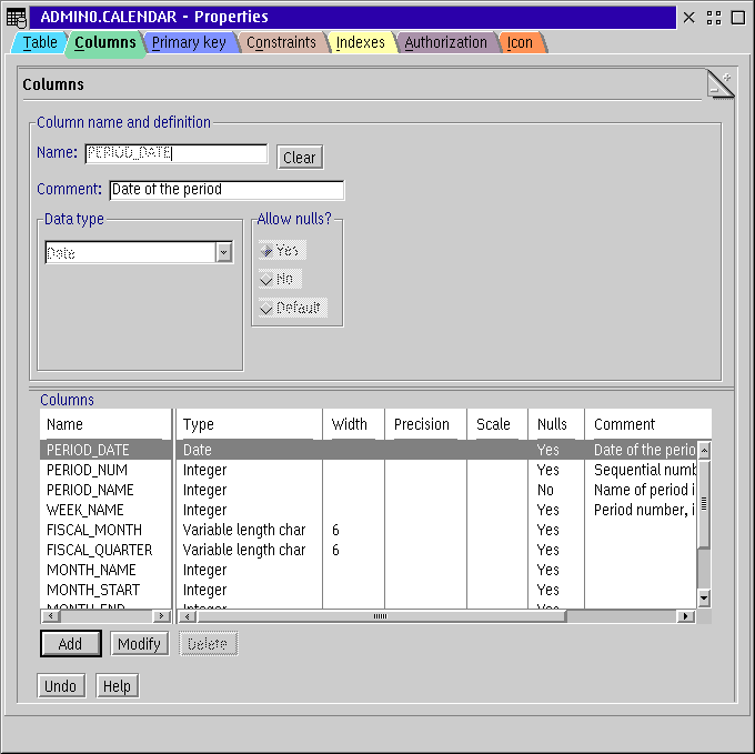 Table properties include things that make sense for a table: columns and their definitions, constraints, primary keys and indexes, and authorizations. The Columns page is shown below.