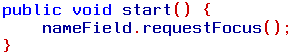 This code doesn't need much explanation. We add another sub panel, the bottom one, to the main panel. In turn, the main panel is added to the applet itself. As an extra exercise you may add some tool tips to the name field and the message field, perhaps that a user shall end input with an ENTER. With this the "constructor" is done. The object now waits for the browser to say 'start' so let's do that method. The start method will simply put the focus at the namefield.