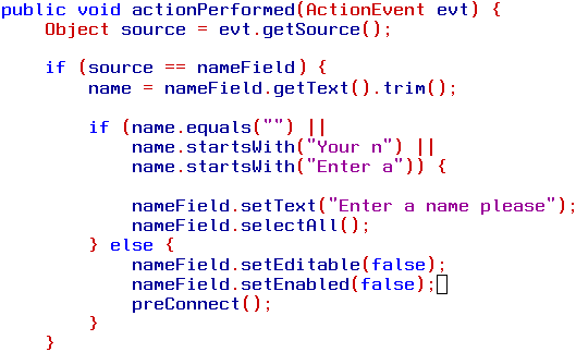 Since a user name is required--how else would other users know who said what?--we need to test for that. This routine simply asks the user to supply a name. If a so called valid name is given the user should not be able to change name as long as the connection is up. Finally we call preConnect that does some work, we will come to that in a moment. Now we will continue with the actionPerfomed method.