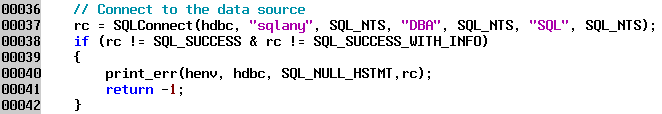 This shows connecting to a SQL Anywhere data source; the user ID is dba and the password is SQL. Whether the user ID and password are case sensitive is dependent on the database driver. The third parameter in this function indicates the length of the data source name; SQL_NTS means that the string is a null terminated string. Generally you can use SQL_NTS for length parameters any time you are passing C strings, otherwise you would have to pass the actual number of bytes in the name parameter. Notice on line 40 that the third parameter, the statement handle, is null. This is because there is no statement handle allocated. If there were no connection handle allocated then we would pass a SQL_NULL_HDBC value for the connection handle. While this example connects to a data source it doesn't do much in the way of output.