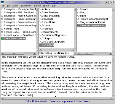 The obvious first "actor" to create in our Take Notes model is the musician. Similarly, the endless loop represents the most obvious "thing". The next entity to classify, and the most awkward is accompaniment. This object is difficult because it exists as a property of a recording inside the endless loop which it retains when it that recording is extracted to a named track. So is it a "thing" or an attribute of another "thing"? For the moment, since we are not looking to jump straight to class diagrams and hierarchies, let's just call it a "thing" (and make notes). Similarly the words take and section referring to areas within the endless loop are probably best labeled "things" for the time being as well. The ability of VisualAge UML Designer to add objects on the fly by marking text and creating links is extremely useful as you work through the use-cases identifying nouns and classifying them. Most of the nouns should turn out to be actors or things, however in the Take Notes model I did manage to identify at lease one concept, corresponding to the phrase "cycle time".