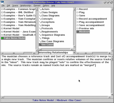 The remainder of Chapter 5 of the Redbook covers what steps to take in what order, and how many iterations to perform to achieve the appropriate level of cross-referenced documentation, far more comprehensively than this article. Rather than repeat it I will try to describe the net effect of following those instructions versus not following them. Suppose you use the "textual" stage of analysis to determine which use-cases are in fact part of other use-cases. For an example you might decide "Preview mix" is part of (is used by) "Record accompaniment" - since you have to be able to hear the track(s) in order to accompany them. When you come to create the use-case diagrams (covered in Chapter 6) the "Hide/Show Relationships" option on the context menu of the "Record accompaniment" use-case figure will bring up an option to automatically create the "Preview mix" use-case figure on the diagram with the correct relationship. The screen print below shows the use-case diagram "generated" via the relationships already built in the model.