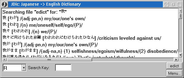 JavaDictSlightly unfortunately named, but I gather this is due to it being an entry in a Java programming contest or somesuch. JavaDict is actually a Java-based Japanese dictionary. Yup, just Japanese, no other language. By the way, I don't speak or read Japanese, so please feel free to correct any errors!You can download it free of charge as it is under the GNU license. (So yes, if some of you feel like modifying for a Chinese dictionary, feel free I guess). There isn't really much of an installation, just unzip it into some directory and type: java JavaDictto start up the dictionary. It works fine using Java 1.1.8 using a PII-300MHz machine.