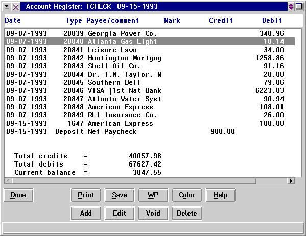 The interface for entering account transactions is not the best that I have ever seen. The same dialog box is used for every transaction in my checking account. The only difference between any two transactions is that, when entering a check transaction, there is a line for "Payee", while in the rest of those transactions, that line is marked "Comment". This can lead to confusion if you are trying to tell at a glance if you are entering a check, an ATM transaction, or making a deposit.