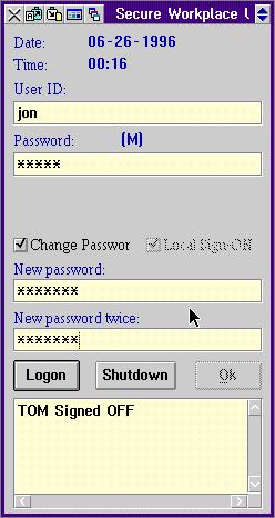 Security clearance was implemented dynamically as I repeatedly logged in and out as any one of my users. Logging in as Tom allowed me access to the D: drive object and I was able to work on data. Logging in as Mary revoked that access but gave me access to all files and folders within the DeScribe folder (so I could perform file maintenance duties) and I moved some files that I wanted Documents group members to work on to the Desktop Documents folder. Logging in as Fred set me back to the Everyone group security level but with the added function of being able to manipulate objects inside Fred's personal folder on the Desktop. I then logged in as myself to see what I could see. Once I was authenticated, the SWP utilities folder and OS/2 System folder magically appeared on the Desktop and my system basically performed as if I had never installed the SWP product -- complete unfettered access to everything!