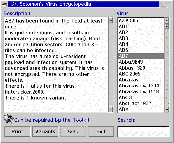There is one other button in the main screen (GIF, 25.2k), which is perhaps the biggest advantage of Dr. Solomon's Anti-Virus over all its competition! This button leads to a virus encyclopedia (GIF, 21.6k), which tells you about the various known viruses. This encyclopedia tells you what a virus does, gives you a clue as to its capabilities (whether it is encrypted, stealth, etc.), tells you whether the virus is memory resident and gives any known variants on the virus. You will also be told how damaging the virus is and the approximate repair time -- if the damage can be repaired.