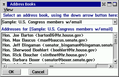 PRM lets you create multiple address books, with up to five e-mail addresses associated with each nickname. This is very useful for me, since most of the people I converse with have multiple addresses.