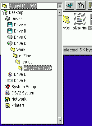 What's also present is a drop-down list (.GIF, 7K) of the folder's parent directories (all the way back to the root or drive object), other drive objects and four of the main System folders (System Setup, OS/2 System, Network and Printers). But while this drop-down list is in the same place as the "Favorite Folder" list is in the Object Navigator, it does not appear to let you add your own folders. I wasn't exactly convinced I needed ultra-fast access to my System Setup from every folder on my desktop.